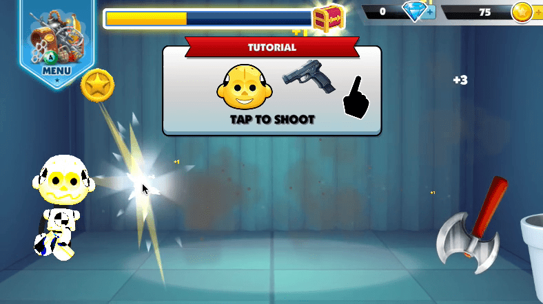 Vale lembrar que para as moedas encontradas, você pode melhorar sua arma, e com uma arma melhorada, você pode derrubar um número muito maior de moedas. Entre outras coisas, durante o jogo, o sistema jogará para você vários bônus que você precisa pegar. Eles simplificarão a jogabilidade, ou permitirão que você personalize o boneco, o que também é bastante divertido.