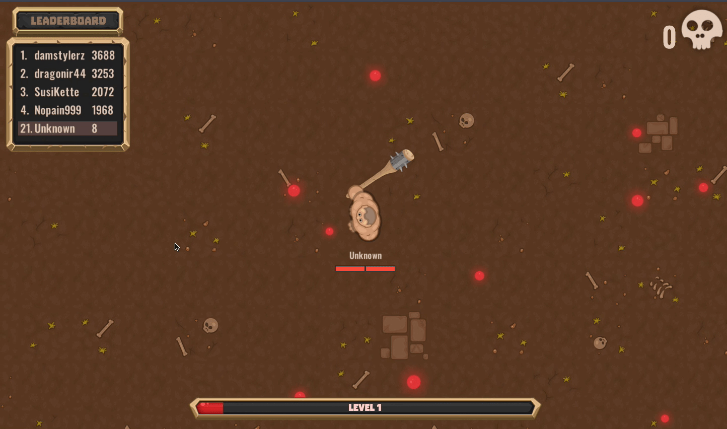 Empiezas el juego como un guerrero normal de nivel 1 que va armado con un simple garrote y una irresistible sed de vivir. Tu objetivo es subir de nivel y matar a los enemigos lo más rápido posible. La mejor manera de hacerlo es seleccionar recursos en forma de puntos rojos, de los que toda la arena está generosamente sembrada. Estos puntos vuelven a aparecer regularmente en el mapa, y también aparecen de los cadáveres de los enemigos. Sin embargo, ¿merece la pena la extracción de recursos de un riesgo tan grande como una lucha con un enemigo feroz, cuando puedes simplemente pasar por las afueras de la arena y obtener rápidamente el potencial militar necesario? Tú decides.