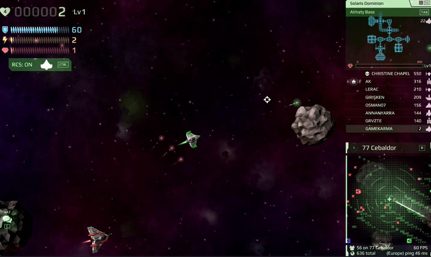Los controles principales están en el ratón. Indica la dirección de la nave y dispara con el cursor. La activación del motor se hace con el botón derecho del ratón. El juego cuenta con toda una serie de equipos de chat, cada uno de los cuales se activa con una tecla distinta. Al pulsar cualquier botón, el sistema te mostrará inmediatamente algunas indicaciones.