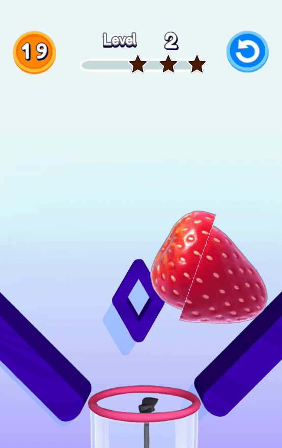 La procédure pour couper les fruits est très simple : déplacez le curseur sur le fruit et définissez la ligne de coupe. N'oubliez pas que les morceaux coupés peuvent s'empêcher de tomber dans le mixeur. Par conséquent, si vous avez besoin de couper à nouveau un morceau de fruit, ne vous retenez pas. Il n'y a pas de conditions préalables ni de nombre limité de tentatives pour couper le fruit dans le jeu. Toutes les autres interactions avec les éléments actifs du jeu se font à l'aide de la souris.