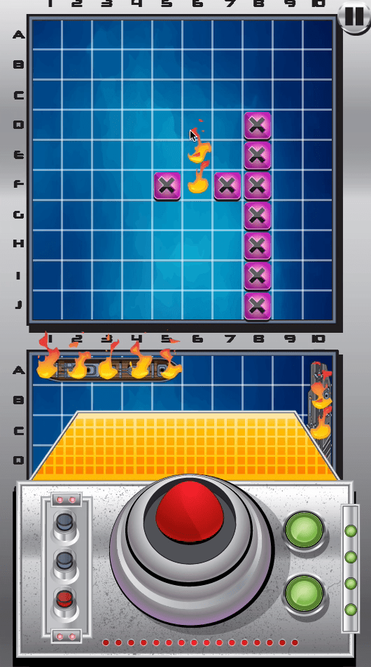 All controls are placed in the game's graphical interface, which you can interact with using the mouse. Direct the mouse cursor to the square of interest, select it with the left mouse button, and then click on the big red button located at the bottom of the game screen. If a hit occurs, the system will show you some fire at the place of the shot and you will have to determine exactly how to damage the ship in order to sink it as quickly as possible.
