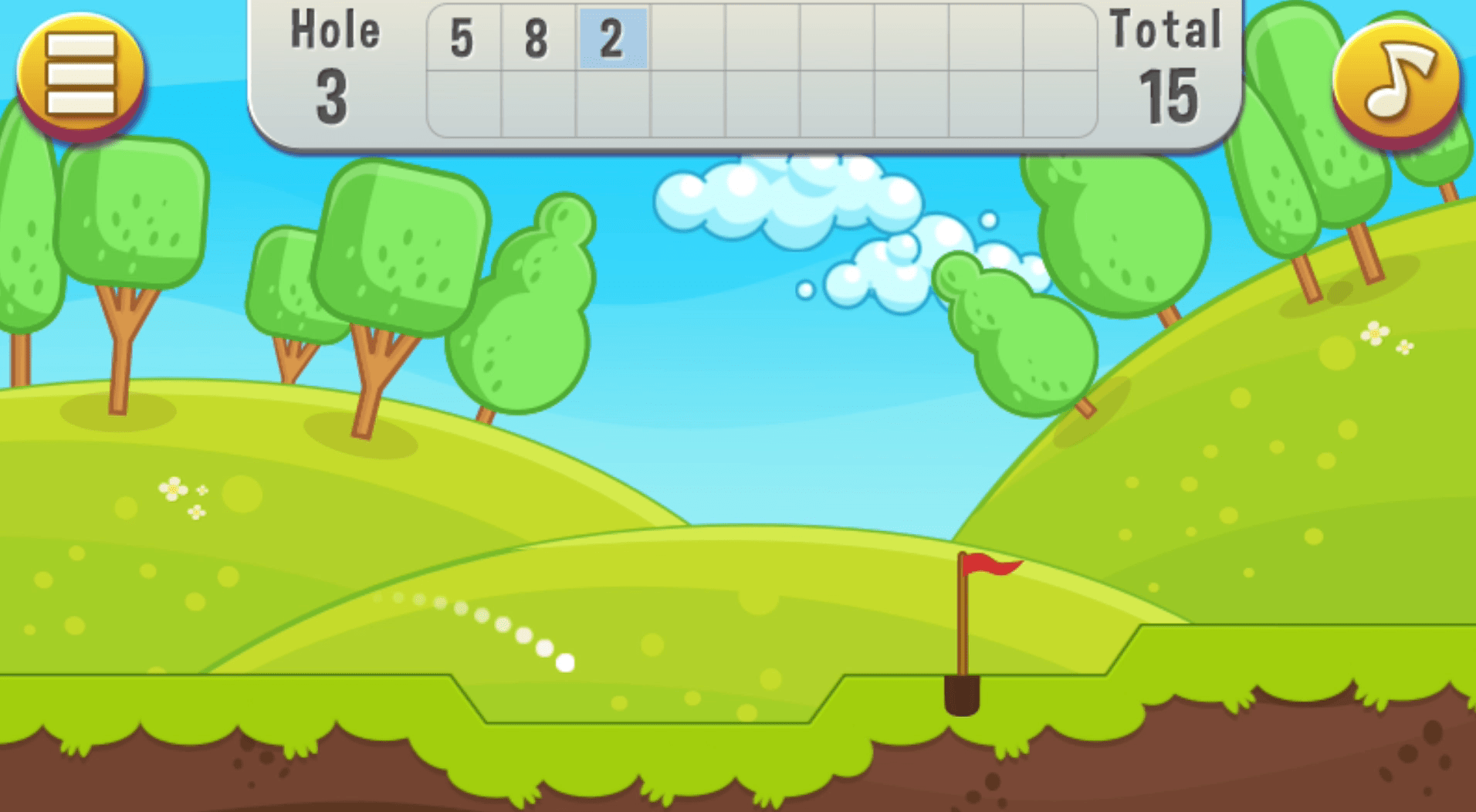 Game controls are fully rendered on a graphical interface with which you can interact via the main organs of the mouse. Aim towards the hole with a guideline. Then hold down the left mouse button and move the cursor away from the ball as much as you want to hit. This remotely resembles a real bow shot, where you need to pull a bowstring, aim, and let go of the bowstring. In this case, the system will tell you the power of impact through color markers. All shades of green indicate a weak impact force, but starting from red to burgundy, the impact force is growing proportionally.