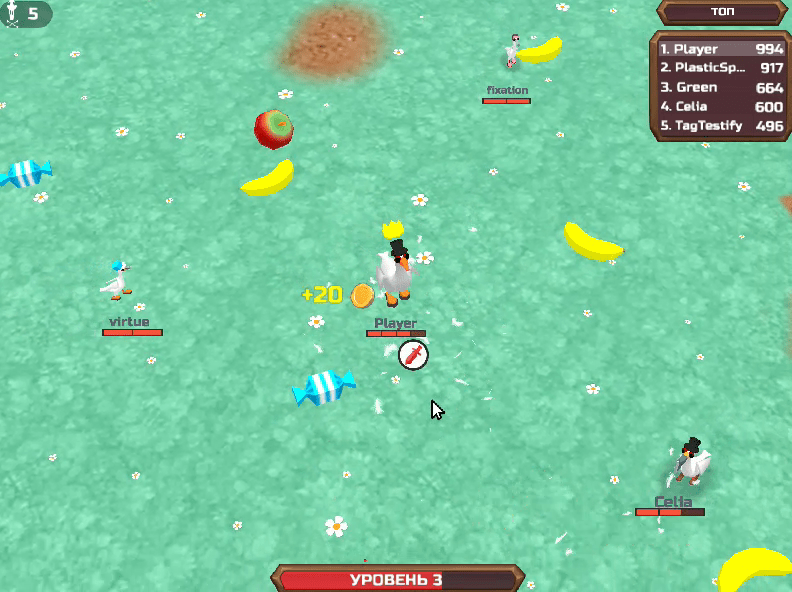 After each kill of the enemy, your goose gains a certain amount of experience, which is converted to the size of your character. In addition to physical increase, you get a noticeable increase in your health, which increases by one point with each new level. All this perfectly complements your increasing strength, which effectively helps to yell at other geese.