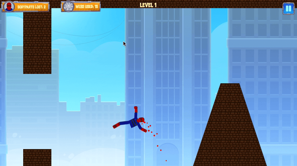 At your disposal is a spiderman, or his doll, as you please. Your goal is to get from the starting point to the finish line and make it so that your character tries to get there with minimal losses. Each collision of a spiderman with hard and sharp objects results in the loss of various body parts. So try to be as careful as possible with your character. The level is considered completed when you cross the yellow line at the end of each location.