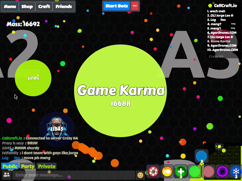 A mecânica de jogo do Cellcraft.io é bastante simples, e é isto que atrai a atenção. Aparece no mapa como um pequeno círculo. A sua tarefa é evitar quaisquer figuras que sejam maiores do que você e ter a certeza de absorver figuras que sejam mais pequenas do que o seu círculo. Assim que apanhar a vítima e começar a absorvê-la com a sua massa, começará imediatamente a aumentar de tamanho em proporção aos inimigos "comidos".